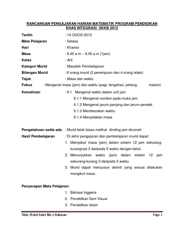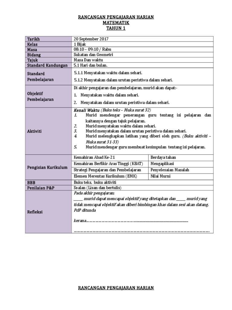 Contoh Rph Kssr Matematik Tahun 4 Masa Waktu