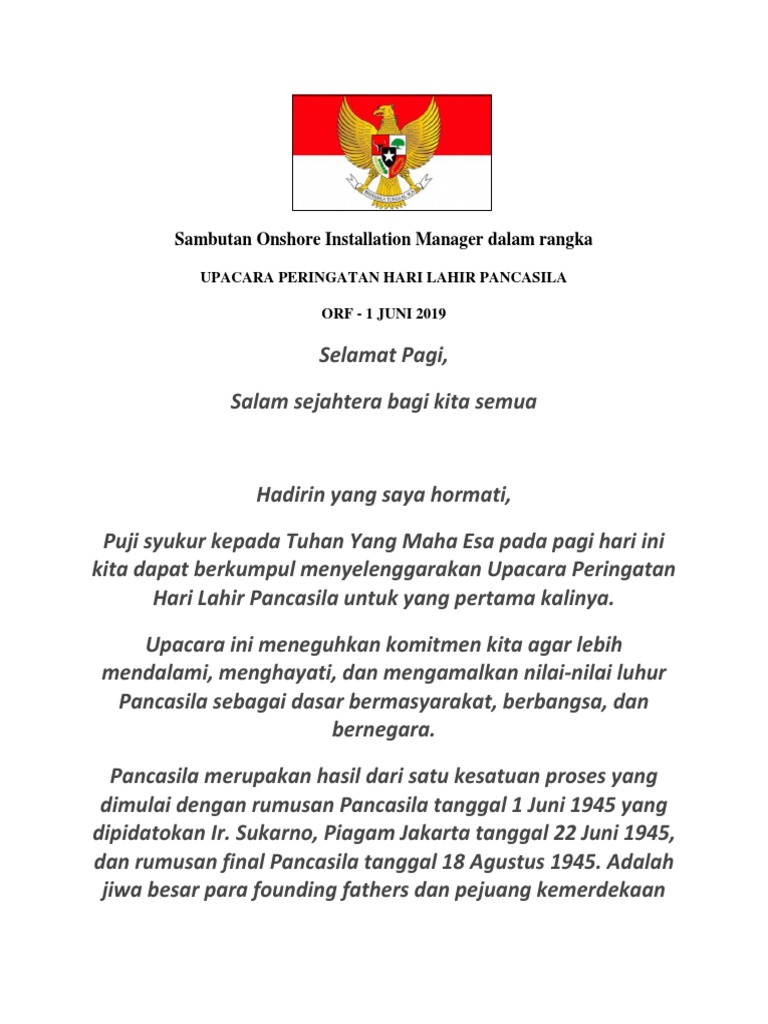 Sambutan Onshore Installation Manager Dalam Rangka Upacara Peringatan Hari Lahir Pancasila Orf 1 Juni 2019