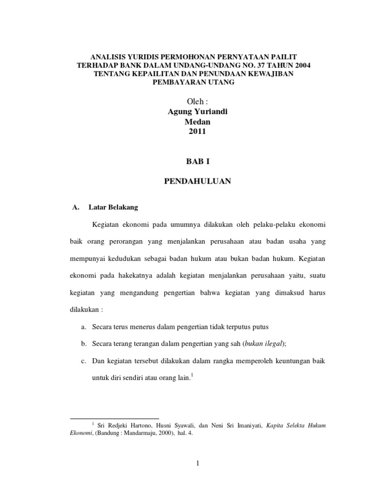 Analisis Yuridis Pernyataan Pailit Terhadap Bank Dalam Uu No 37 Tahun 2004 Tentang Kepailitan Dan Pkpu Agung Yuriandi
