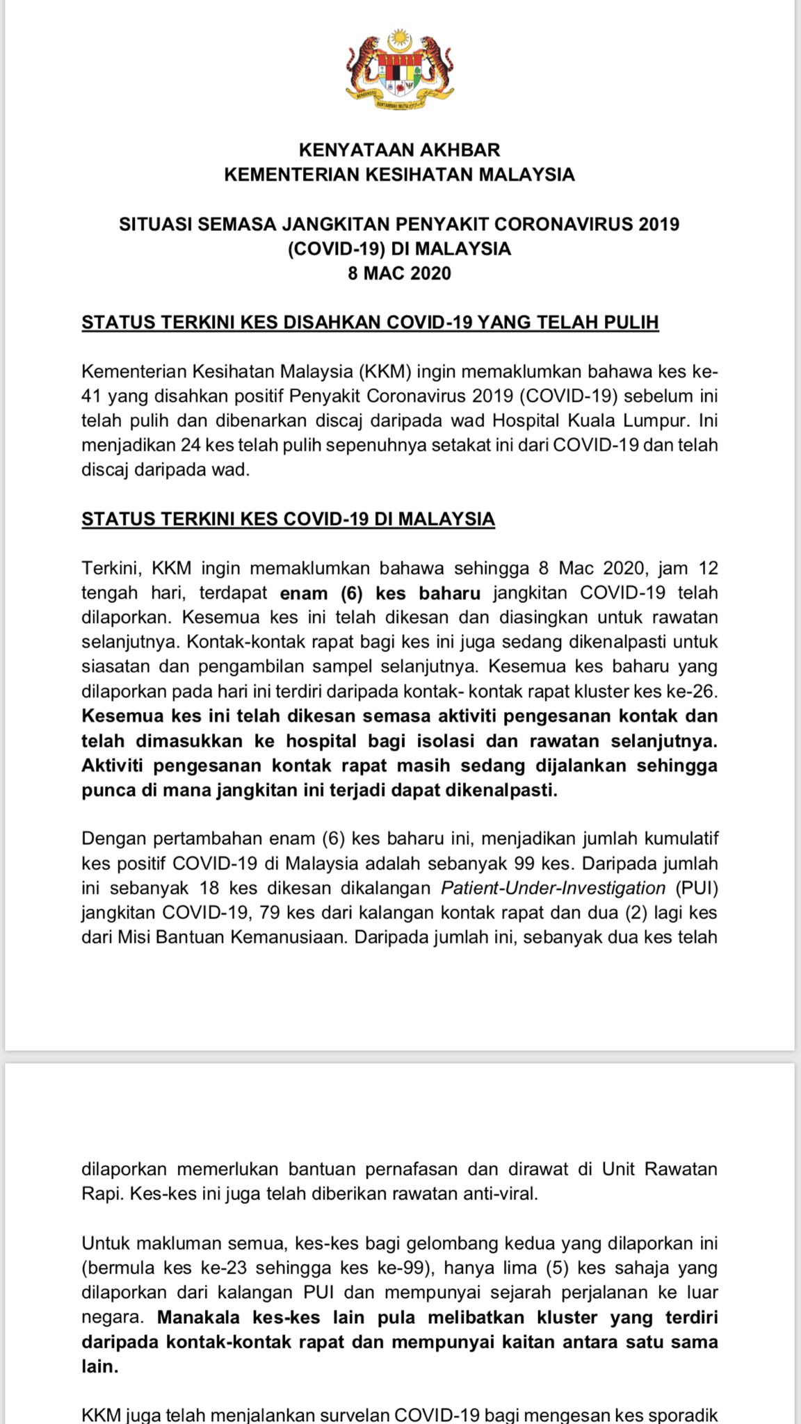 Kkmalaysia On Twitter Situasi Semasa Covidー19 Di Malaysia 9 Mac 2020 1 18 Kes Baru Menjadikan 117 Kes Keseluruhan Setakat Ini 2 Kes Ke 101 Mempunyai Sejarah Perjalanan Ke Iran 3 Dua Kes