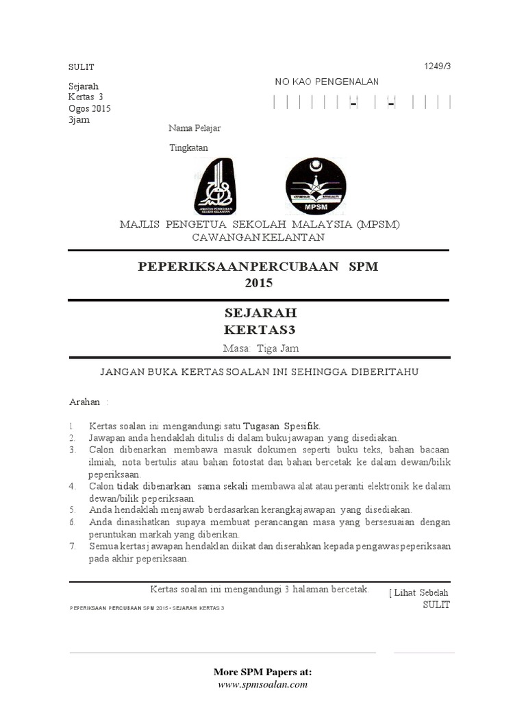 Bahan rujukan sejarah kertas 3 spm 2019 modul pulau pinang bahan rujukan sejarah kertas 3 spm 2019 modul sarawak bahan rujukan sejarah kertas 3 spm 2019 ac bahan rujukan sejarah kertas 3 spm 2019 rk. Contoh jawapan sejarah kertas 3 tingkatan 4 dan tingkatan 5 spm 2020 dan cara menjawab paper 3 ikut skema. Tema umum sejarah kertas 3 spm 2019 kertas 1249 3 telahpun diumumkan secara rasmi. Antara koleksi kertas soalan yang dikongsikan termasuklah subjek bahasa melayu bahasa inggeris matematik matematik tambahan pendidikan islam sejarah sains prinsip perakaunan dan sains.