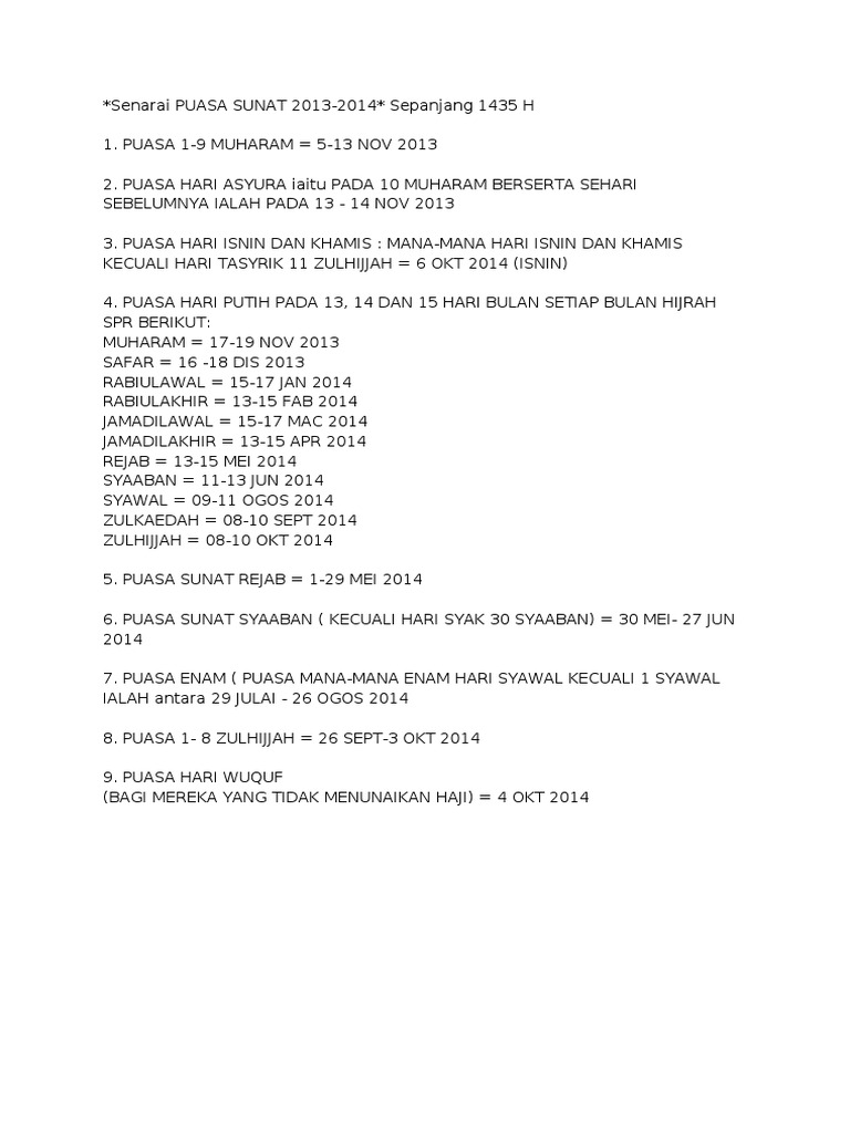 Senarai Puasa Sunat 2014