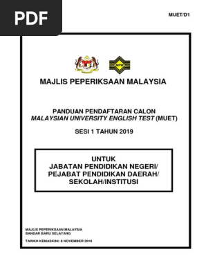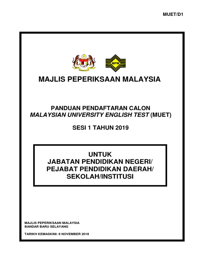 Panduan pendaftaran calon muet tahun 2020 muet d1 tahun 2020 borang akuan ketidakakuran sijil muet. Tarikh pendaftaran dan ujian speaking bertulis peperiksaan muet atau malaysian english university test akan diadakan dalam 3 sesi dalam setahun. Bagi pelajar yang ingin mengambil peperiksaan muet sesi terkini mpm telah pun mengeluarkan kalendar peperiksaan bertulis muet untuk tahun 2020. Bagi mereka yang ingin menduduki peperiksaan muet sesi lain iaitu sesi 1 dan 2 anda boleh merujuk kalendar peperiksaan muet 2020 yang memaparkan tarikh buka dan tutup pendaftaran serta tarikh ujian diadakan.