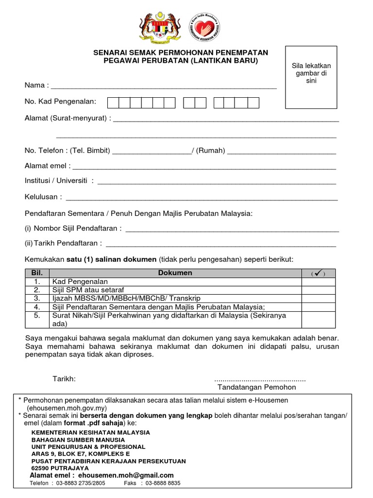 Senarai semak permohonan penempatan pegawai perubatan. Senarai semak permohonan penempatan pegawai perubatan tetap. Borang maklumat diri pegawai pergigian tetap. Keputusan penempatan pertukaran pegawai perubatan gred ud44 seluruh malaysia mac 2014 72. Pemohon seharusnya lapor diri ke bahagian perubatan jkn sabah tingkat 3 rumah persekutuan dan bahagian pengurusan jkn sabah tingkat 1 rumah persekutuan pada tarikh kuat kuasa yang disebut dalam surat penempatan.