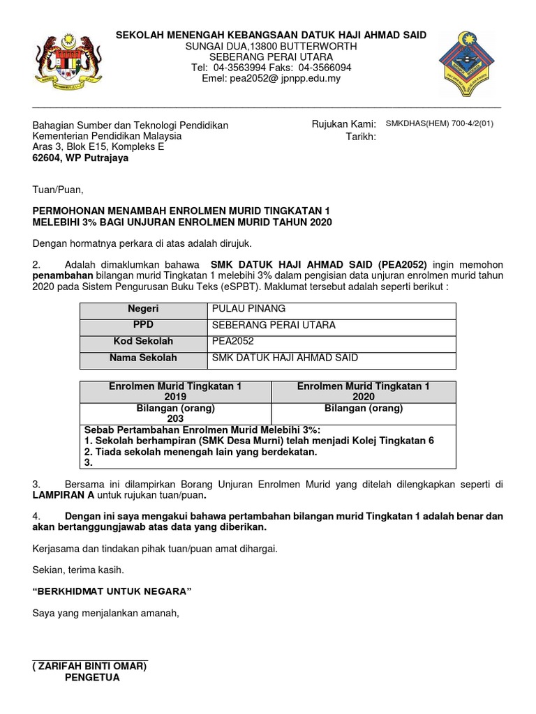 5 Contoh Surat Penambahan Pengurangan Enrolmen Murid Docx