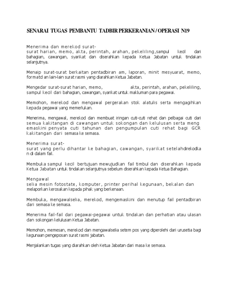 Senarai Tugas Pembantu Tadbir Gred N19 Perkeranian Operasi