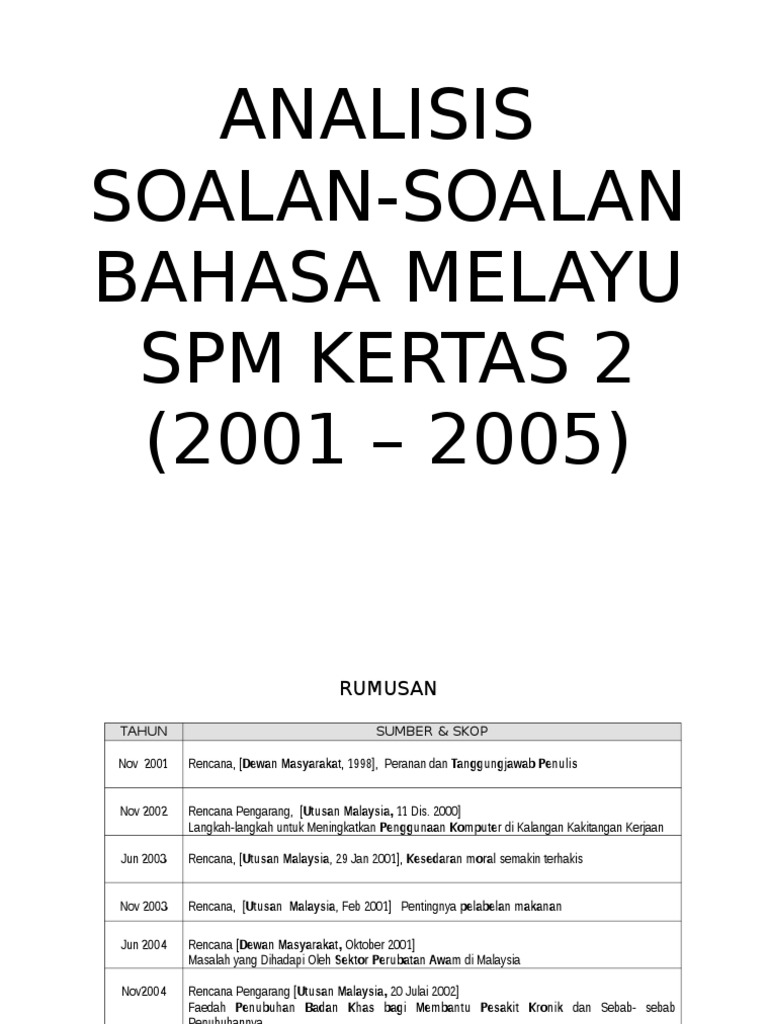 Analisis Soalan Soalan Bahasa Melayu Spm Kertas 2 2001 2005