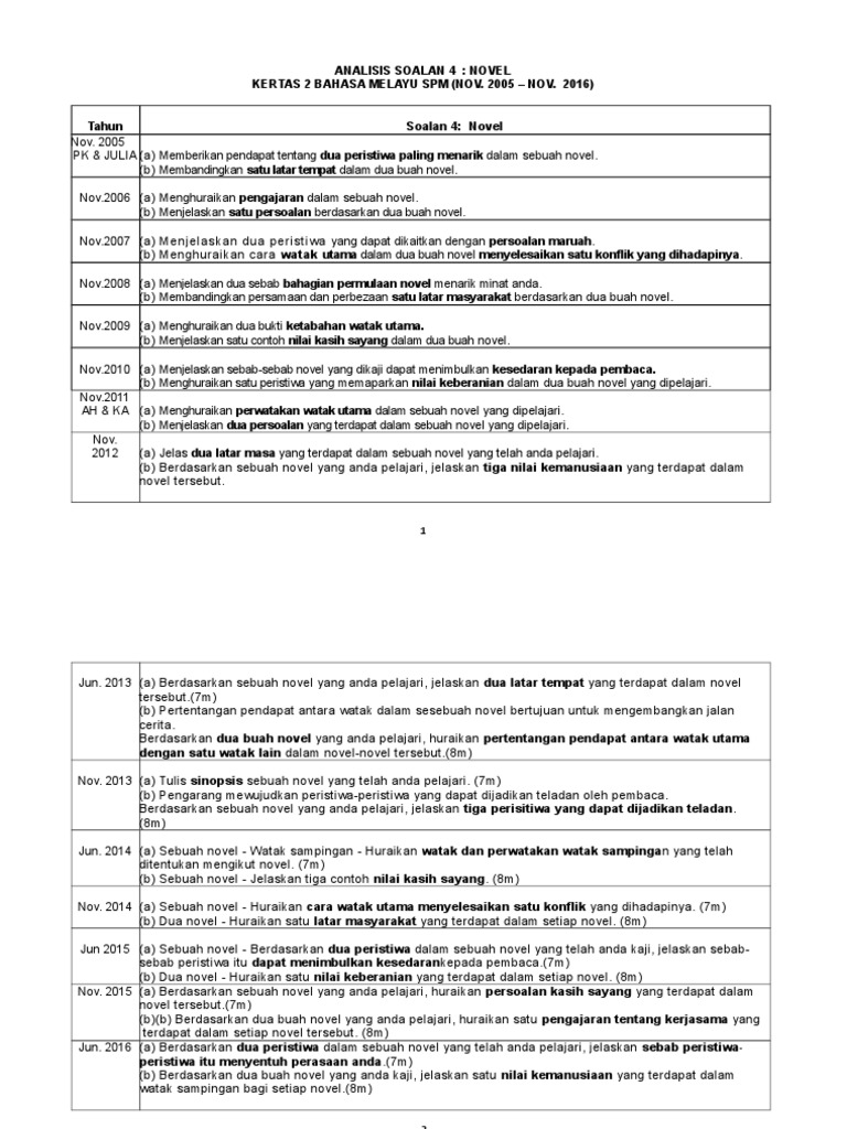 Analisis Soalan 4 Novel Kertas 2 Bahasa Melayu Spm Nov 2005 Nov 2016