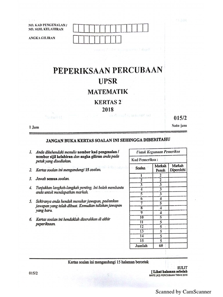 Soalan Percubaan Upsr 2018 Matematik