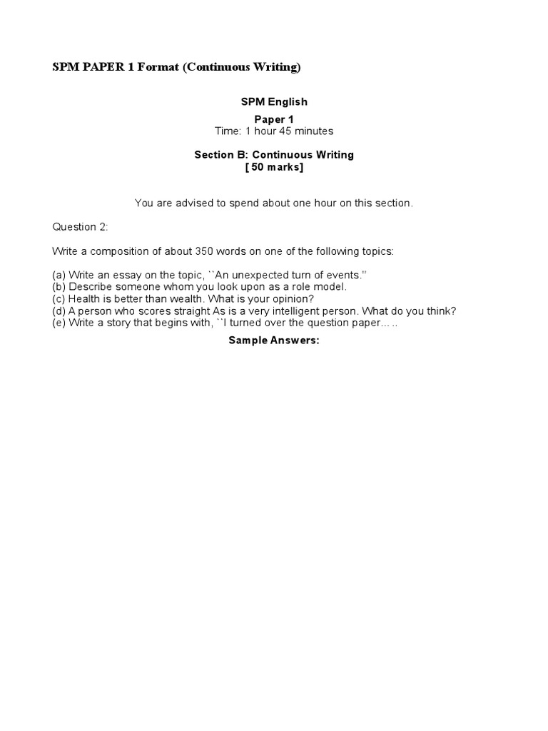 Directed continuous writing sijil pelajaran malaysia. 2 honesty is the best policy describe an experience when this was true for you. English bahasa inggeris spm. Sila klik pada pautan soalan jawapan untuk paparan atau muat turun.