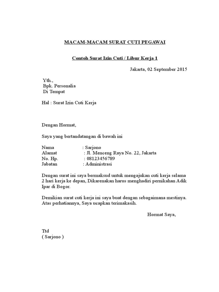 18 Contoh Surat Izin Cuti Libur Tidak Masuk Kerja Bagi Karyawan Pns Dan Pegawai Swasta Contoh Surat