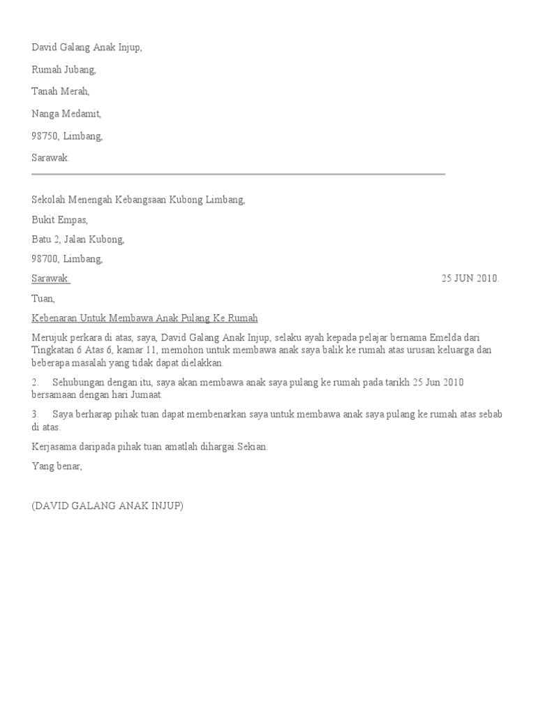 Contoh Surat Kebenaran Membawa Anak Pulang