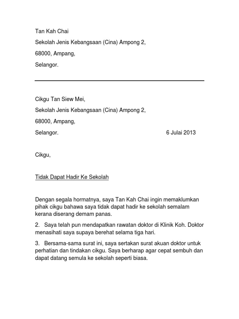 Contoh Surat Tidak Hadir Ke Sekolah Dengan Pelbagai Alasan Yang Munasabah Ohcewek