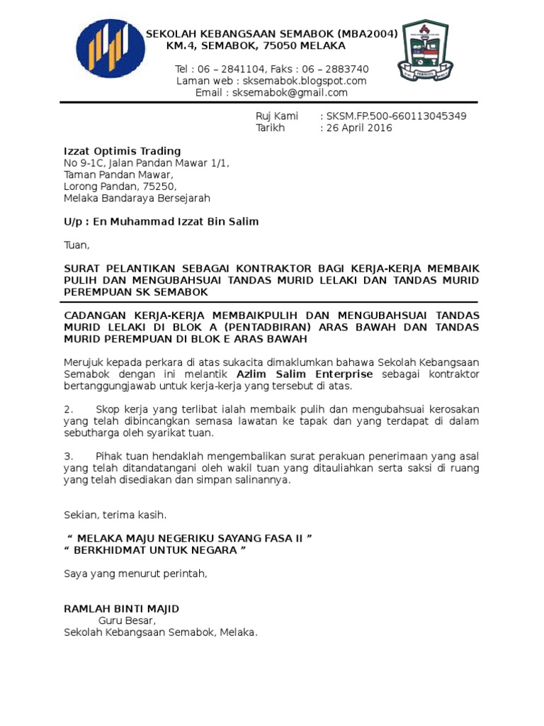 Surat Pelantikan Kontraktor 2016 Izzat Optimis Tapak Perhimpunan