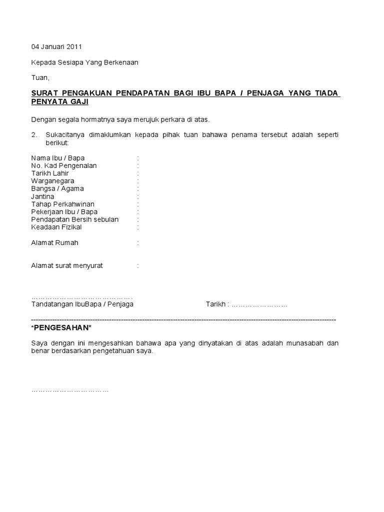 Surat Pengesahan Ibu Bapa Tanpa Penyata Gaji
