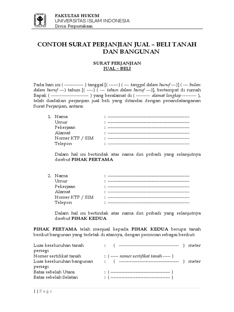 Contoh Surat Perjanjian Jual Beli Tanah Dan Bangunan3 Fh Uii Doc