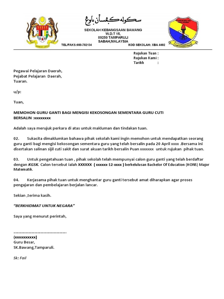 Contoh Surat Rasmi Permohonan Guru Ganti