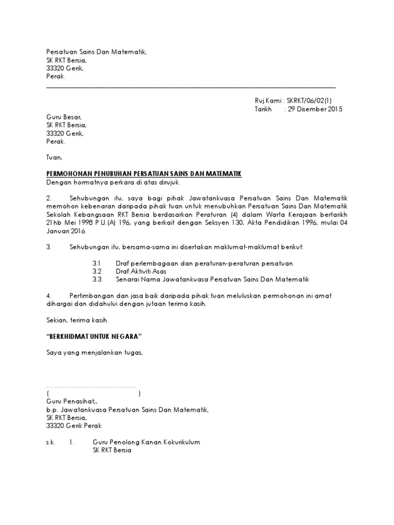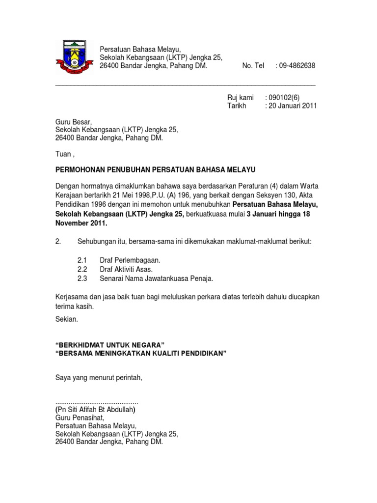 Contoh Surat Permohonan Penubuhan Kelab Dan Persatuan Bahasa Melayu