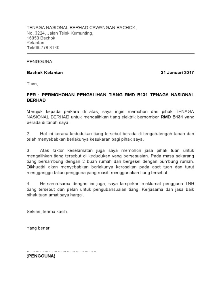 Contoh Surat Alih Tiang Elektrik Tnb
