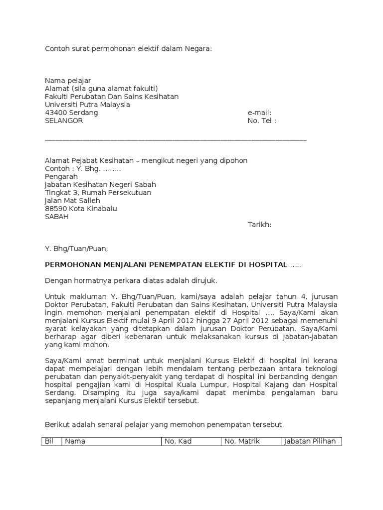 Contoh Surat Permohonan Elektif Dalam Negara Kepada Pelajar