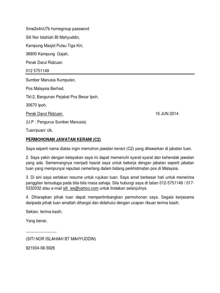 Contoh Surat Rasmi Permohonan Kerja Kerani Surat Nama