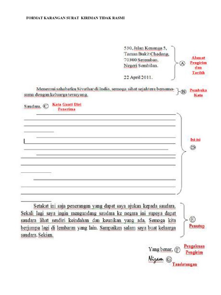 Format Karangan Surat Kiriman Tidak Rasmi