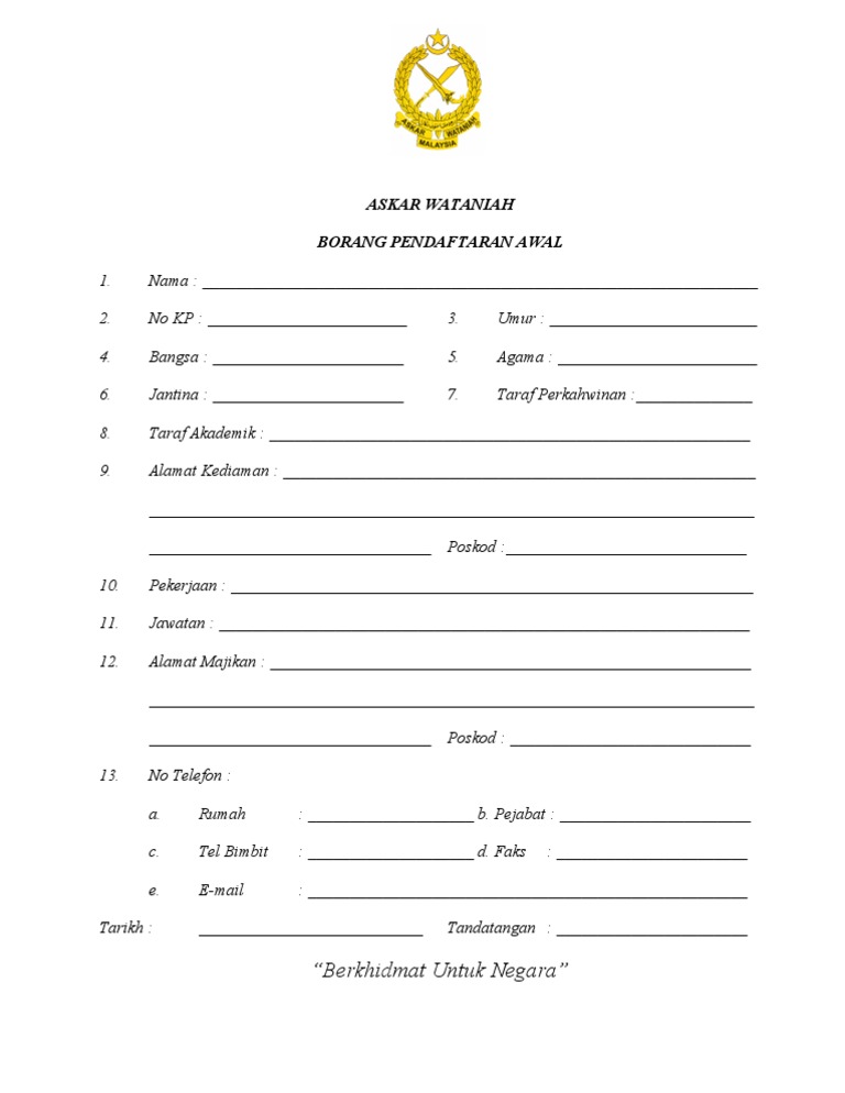 Syarat kemasukan askar wataniah 2020. Untuk pengguna kali pertama sila daftar terlebih dahulu sebelum log masuk ke sistem jom masuk tentera. Tiada sebarang rekod jenayah. Keputusan pt3 2018 sekurang kurangnya 7a termasuk bahasa melayu bahasa inggeris matematik dan sains b. Skim bantuan kemasukan ke universiti awam ua politeknik dari veteren tentera merupakan satu skim yang bertujuan untuk meringankan beban kewangan ketika pendaftaran kemasukan ke universiti dan juga sebagai galakan dan motivasi untuk meneruskan pengajian di peringkat lebih tinggi.