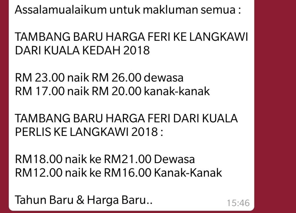 Harga Baharu Tambang Feri Langkawi Destinasi Percutian Facebook
