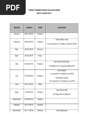 Tarikh Pembayaran Gaji Bulanan Tahun 2018