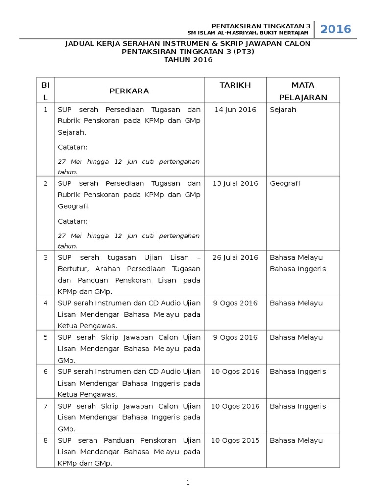 Jadual Kerja Serahan Instrumen Pt3 2016