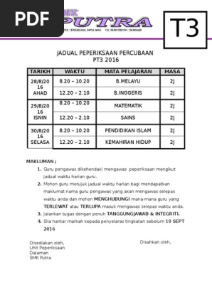 Jadual Peperiksaan Percubaan Pt3 2016 Tarikh Waktu Mata Pelajaran Masa