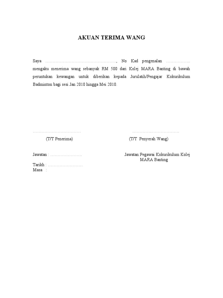 Terima Contoh Surat Akuan Penerimaan Wang