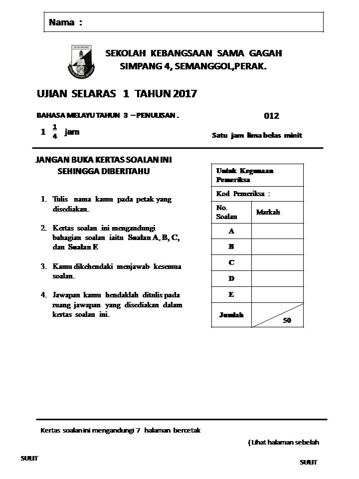 Contoh Kertas Peperiksaan Bahasa Malaysia Tahun 3 Kertas 1