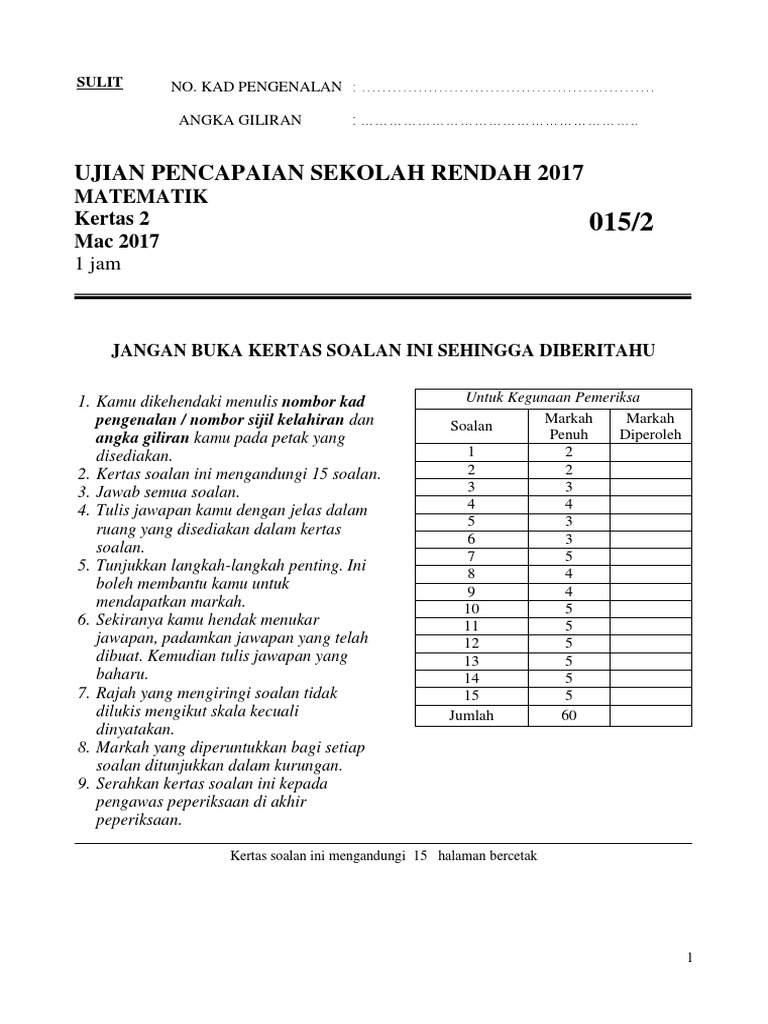 Ujian Pencapaian Sekolah Rendah 20xx 015 Kertas Soalan Ini Kepada Pengawas Peperiksaan Di Akhir Peperiksaan Kertas Soalan Ini Mengandungi 15 Halaman Bercetak Dan 1 Halaman Tidak Pdf Document