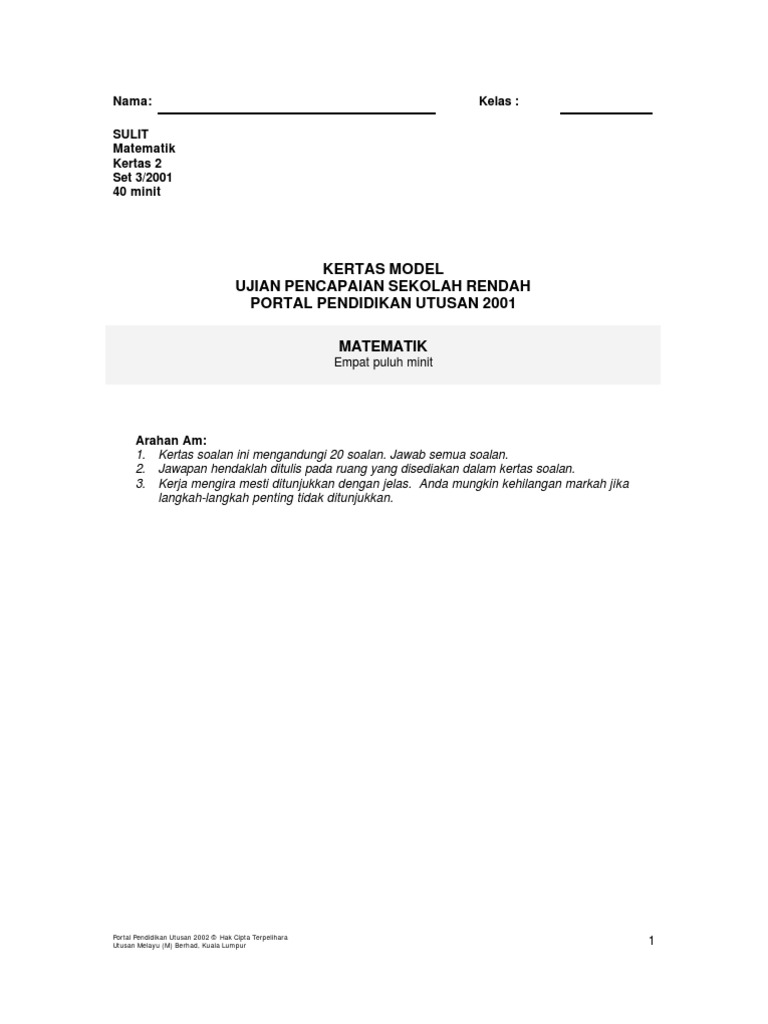 Kertas Model Ujian Pencapaian Sekolah Rendah Portal Pendidikan Utusan 2001