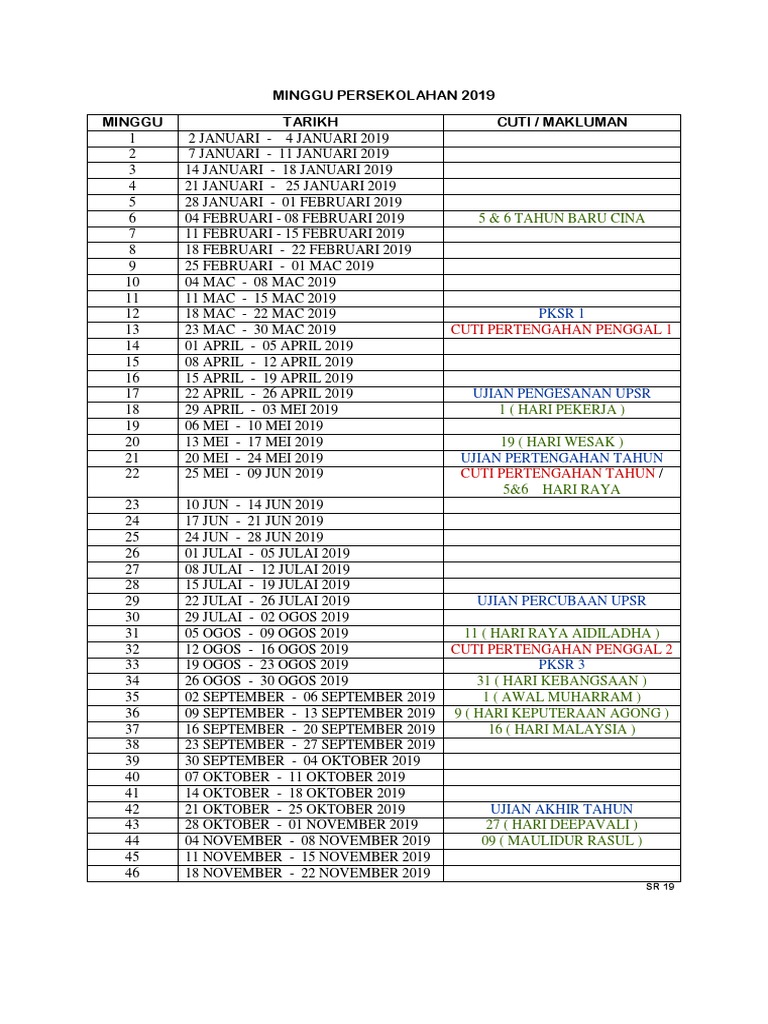 Minggu Persekolahan 2019 Minggu Tarikh Cuti Makluman 5 6 Tahun Baru Cina