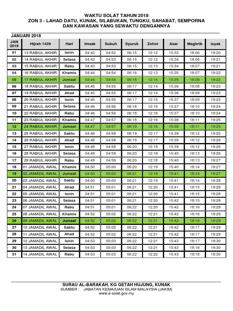 Waktu Solat Tahun 2018 Bagi Zon Zon 3 Lahad Datu Kunak Silabukan Tungku Sahabat Semporna Dan Kawasan Yang Sewaktu Dengannya