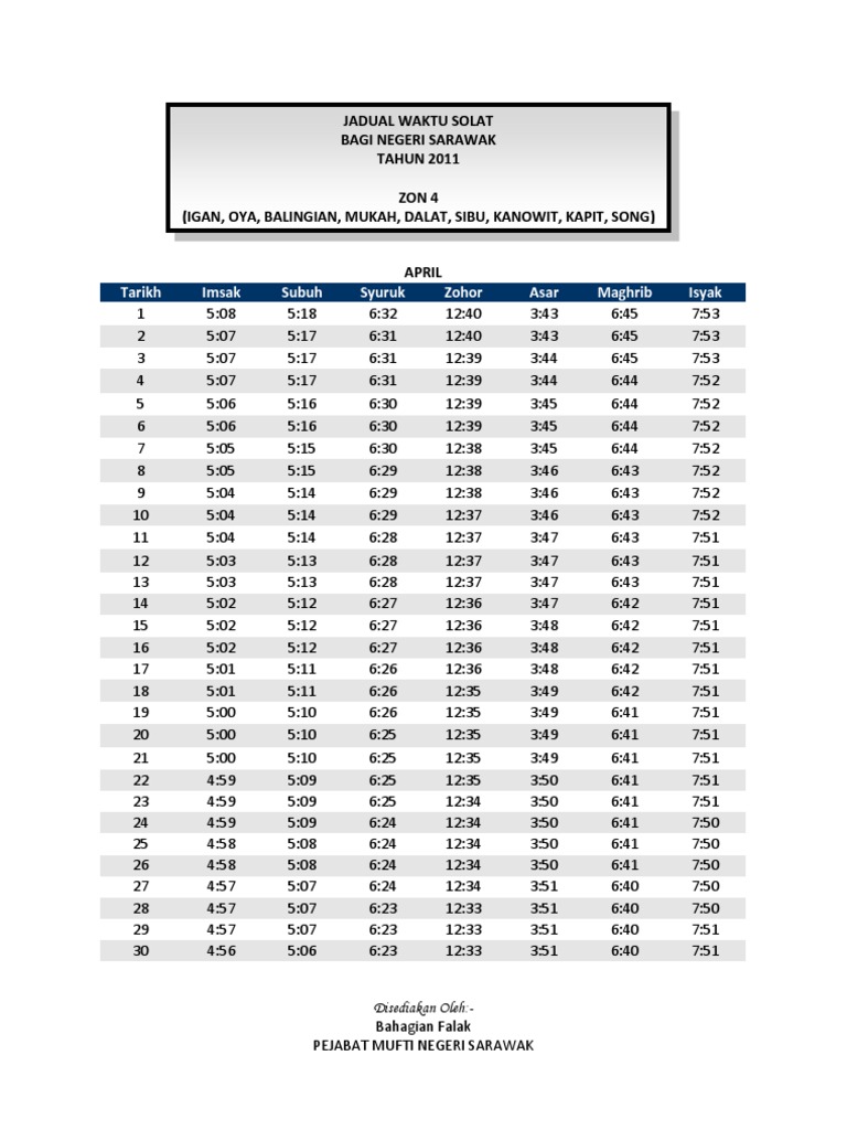 Jadual Waktu Solat Bagi Negeri Sarawak Tahun 2011 Zon 4 Igan Oya Balingian Mukah Dalat Sibu Kanowit Kapit Song