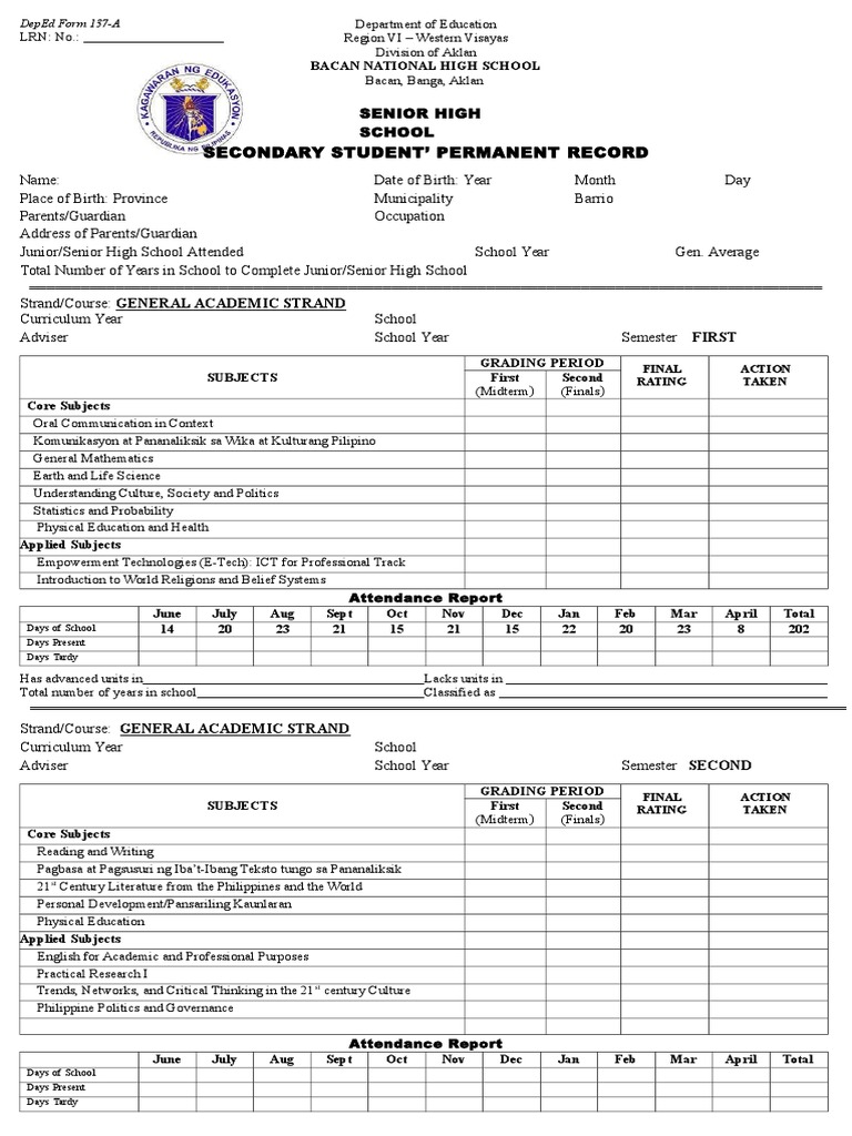 Deped Form 137 Shs 1 Gen Academic Strand Secondary School Curriculum