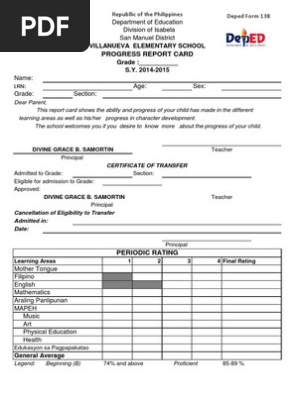Deped Form 138 Report Card Value Ethics Learning