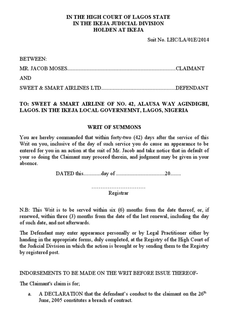 Sample Of Writ Of Summon Docx Writ Lawsuit