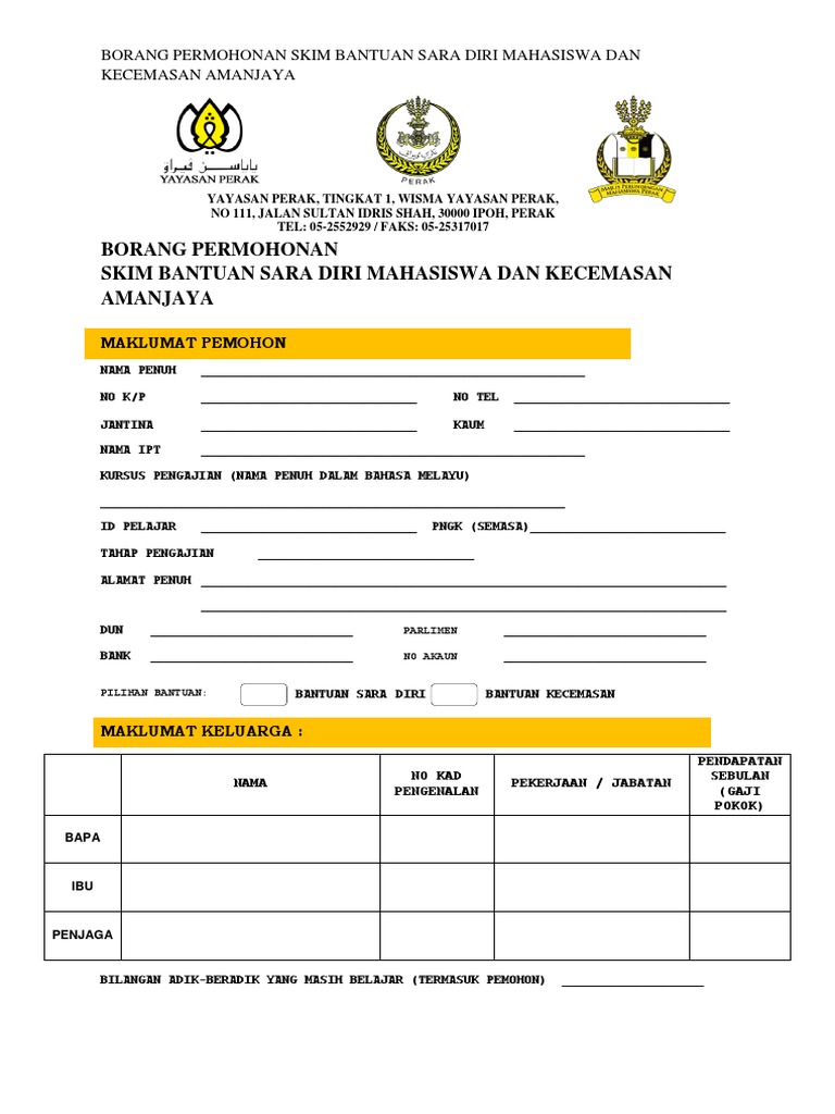 Yayasan perak bantuan sara diri. 05 255 2929 faks. 05 253 1701 ta newspaper by themesarray. Borang permohonan bantuan sara diri dan kecemasan mahasiswa negeri perak juga boleh didapati secara percuma di pejabat yayasan perak pejabat pusat khidmat masyarakat dewan undangan negeri dun di kawasan masing masing. Program bantuandermasiswa yayasan perak dalam luar negarabantuan sara diri mahasiswa yayasan perakbantuan kecemasan mahasiswa yayasan perak.
