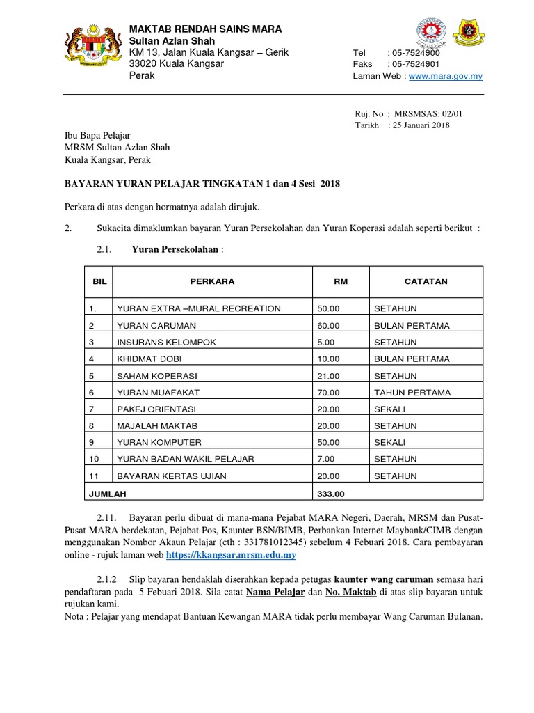 Makluman Bayaran Yuran Bagi Tingkatan Foto Media Mrsm Sultan Azlan Shah Facebook