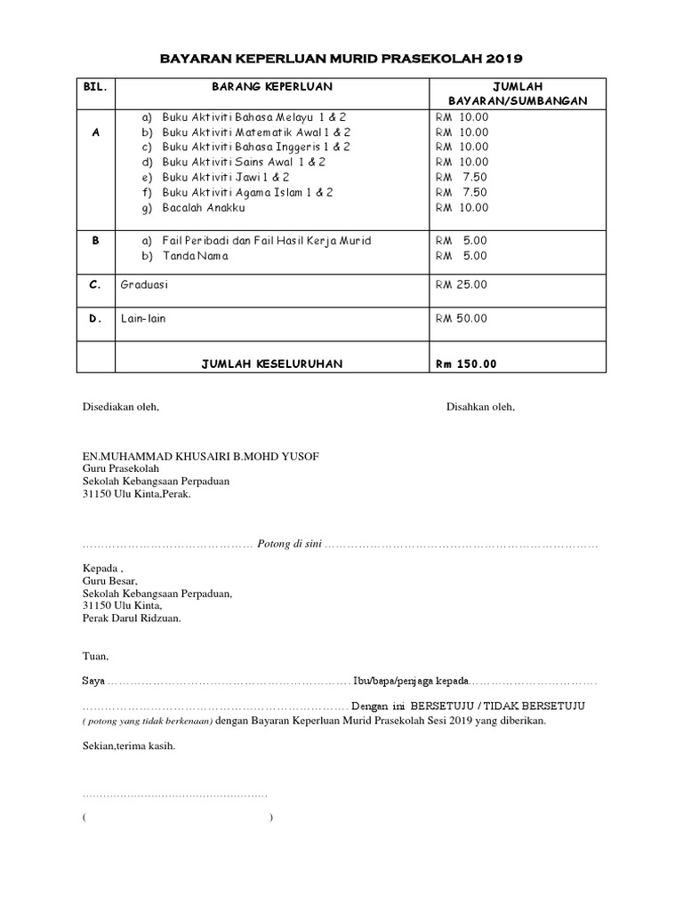 Bayaran Keperluan Murid Prasekolah 2019 Docx